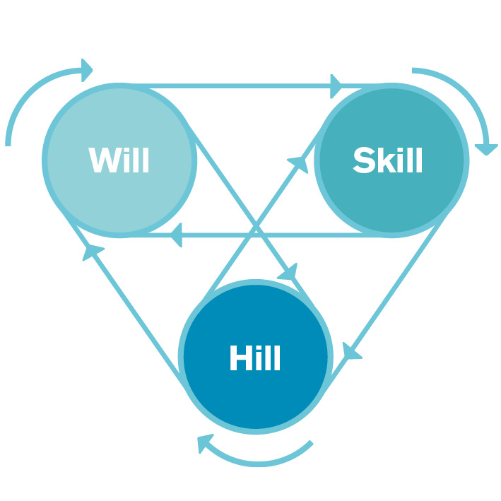 Will-Skill-Hill är en beskrivning av hur de bästa ledarna tänker och agerar för att skapa ett passionerat lärande. Modellen utgår från tre centrala faktorer – deltagarens vilja (Will), förmåga (Skill) och inlärningsmiljön (Hill) – för att leda en positiv och aktiv läroprocess.